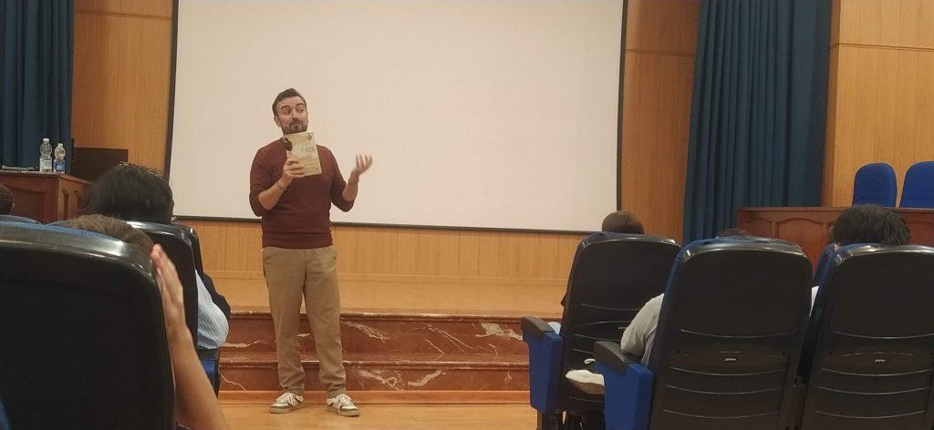 El escritor abordó también aspectos menos conocidos de su oficio, como la figura del “escritor fantasma”, aquellos que redactan libros para celebridades o influencers bajo contratos de confidencialidad. También nos relató cómo una historia familiar acerca de un anillo desaparecido durante 35 años le sirvió de base para otra de sus obras, Como era en un principio, a la vez que le ganó enemistades en su familia. Por último, contó el hallazgo de una biblioteca secreta con 17 libros prohibidos que sus abuelos ocultaron durante la Guerra Civil. Estos ejemplares, escondidos casi un siglo, fueron restaurados por el propio autor, quien ha querido así rendir homenaje a quienes se jugaron la vida por conservar la lectura y la cultura.