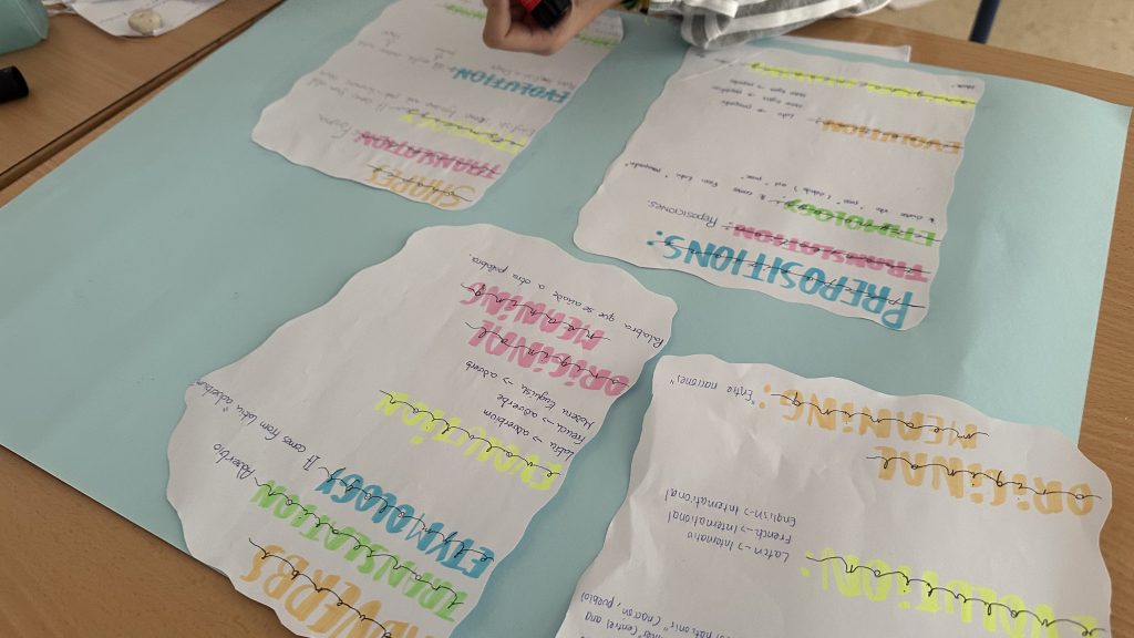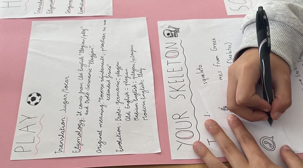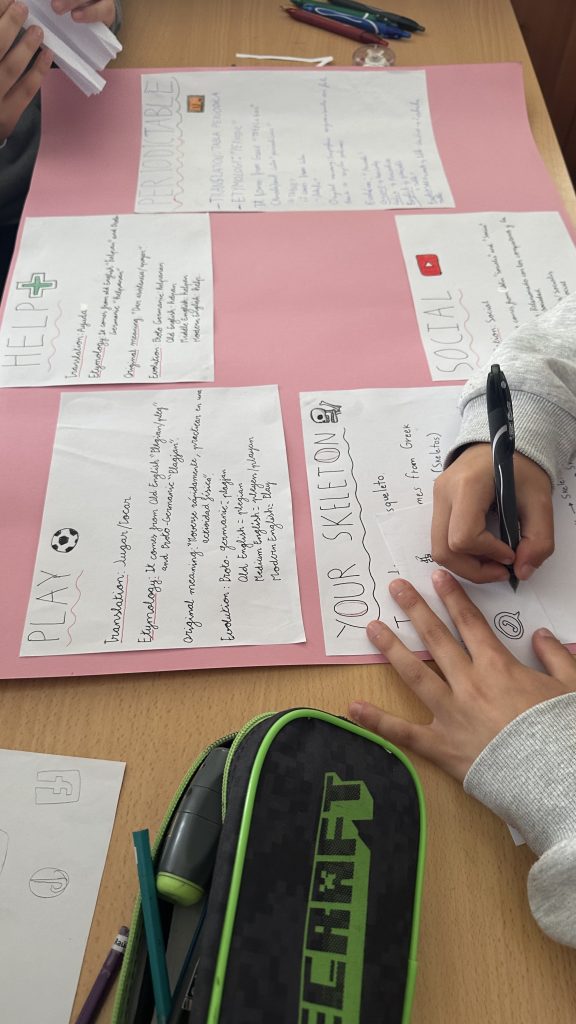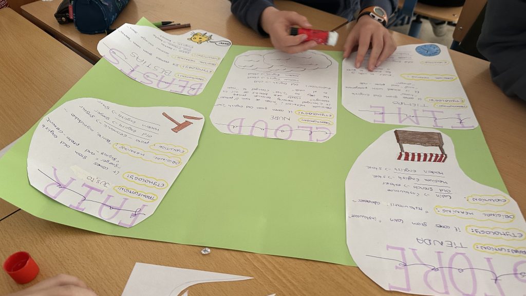 Posteriormente, organizados en grupos de trabajo, seleccionaron cinco de esas palabras para analizarlas en profundidad. El proceso incluyó la investigación de su etimología, su traducción al español y el estudio de los posibles cambios en su significado o pronunciación a lo largo del tiempo, así como su relevancia en el uso actual.