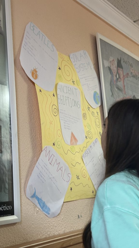 La iniciativa partió de una fase de observación activa en el entorno más cercano. Durante varios días, los estudiantes recorrieron el instituto identificando palabras y expresiones en inglés presentes en carteles, materiales y espacios comunes, que fueron recopilando cuidadosamente en sus cuadernos. Esta primera toma de contacto permitió despertar su curiosidad y poner en valor la presencia cotidiana del inglés en su entorno inmediato.